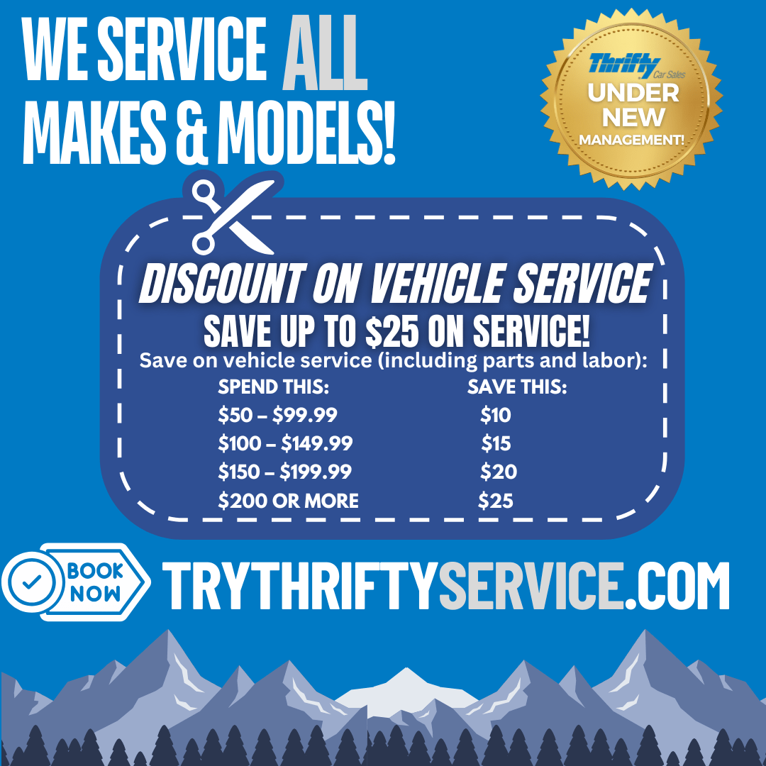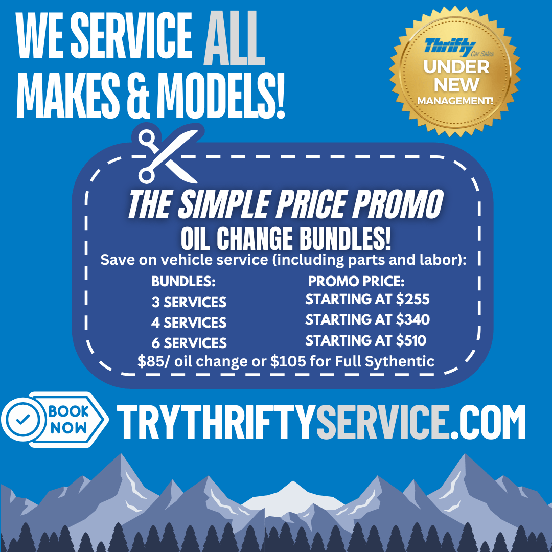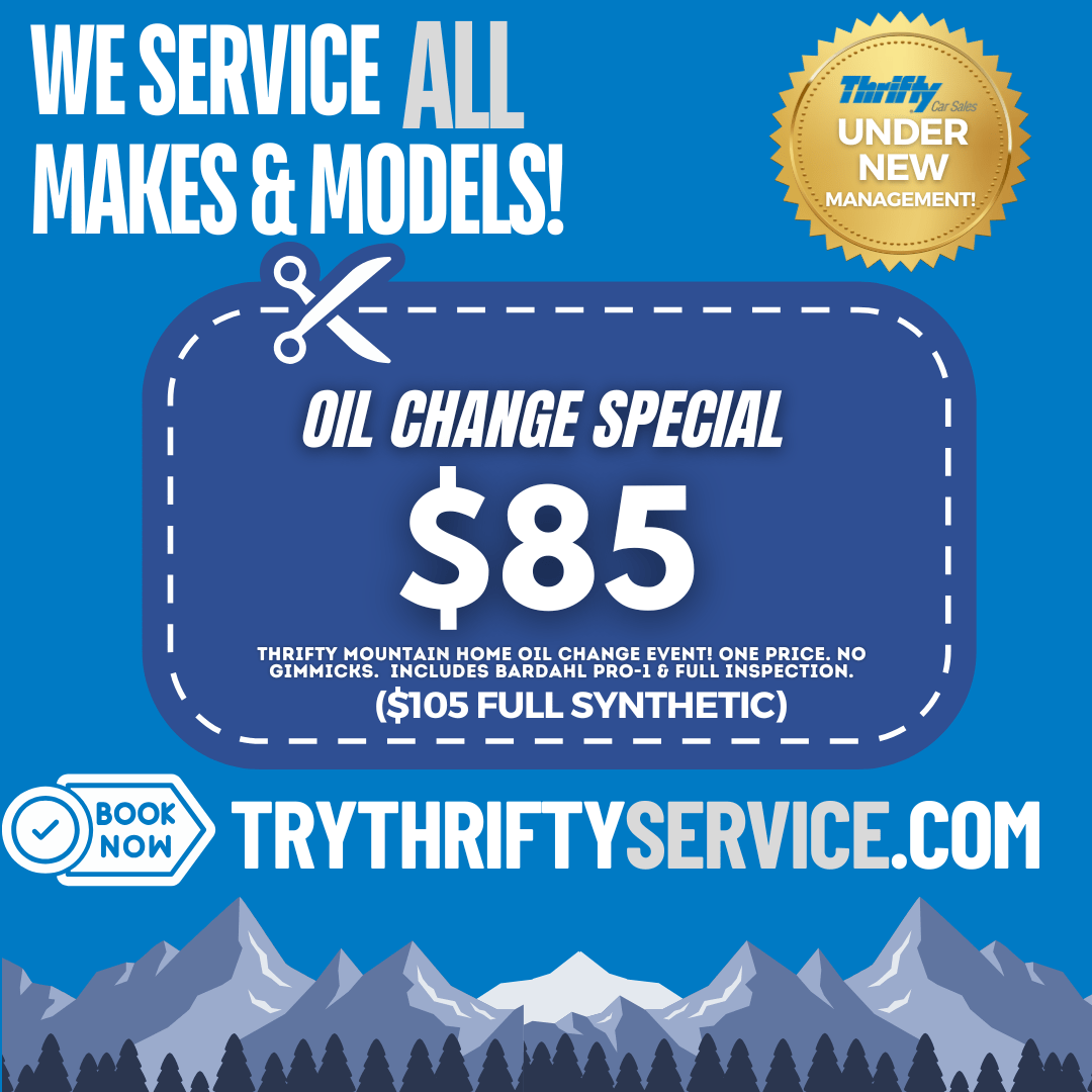 Thrifty Mountain Home Oil Change Event! One price. No gimmicks. $85 oil changes ($105 Full